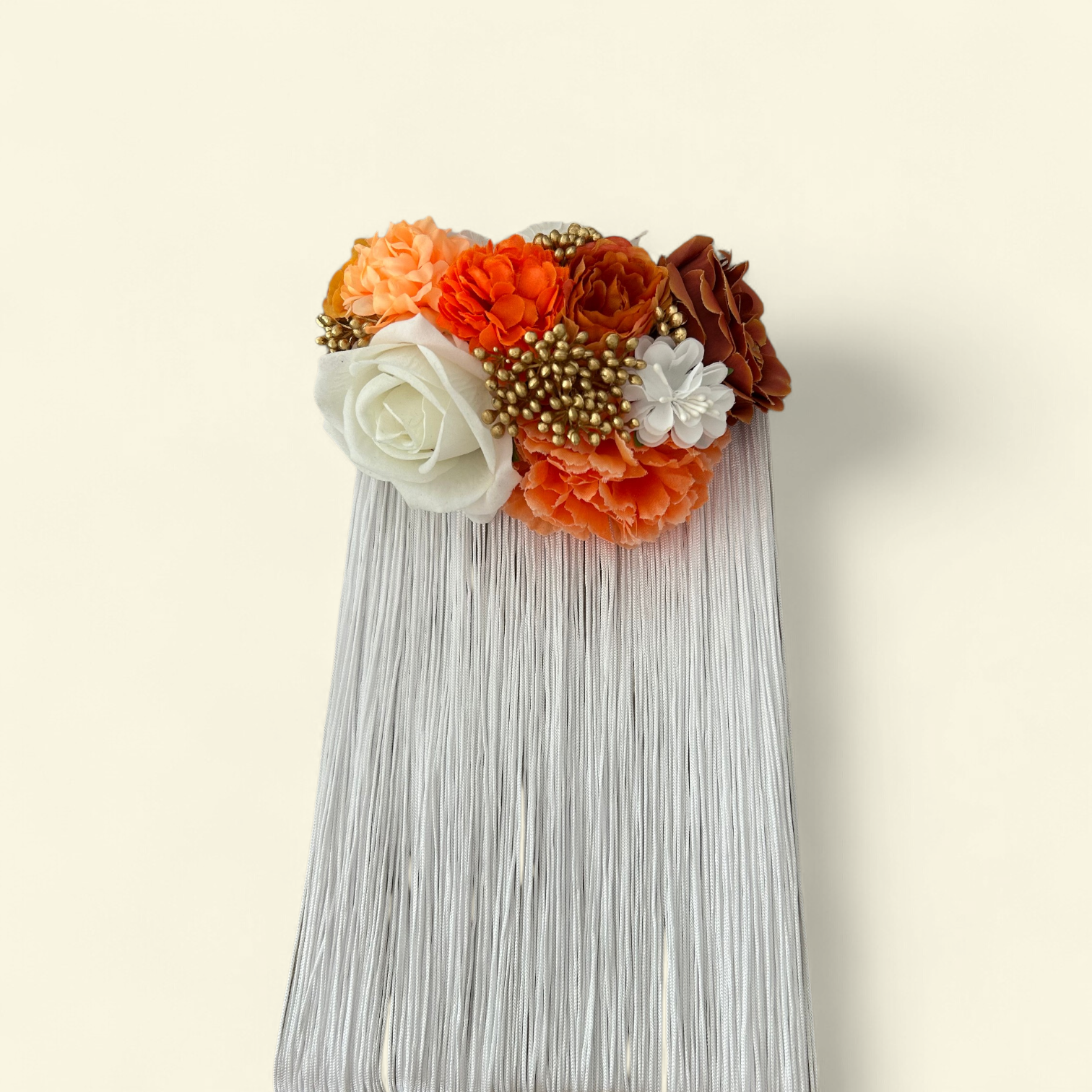 Hombrera 50 cm con fleco blanco, flores blancas y naranjas.