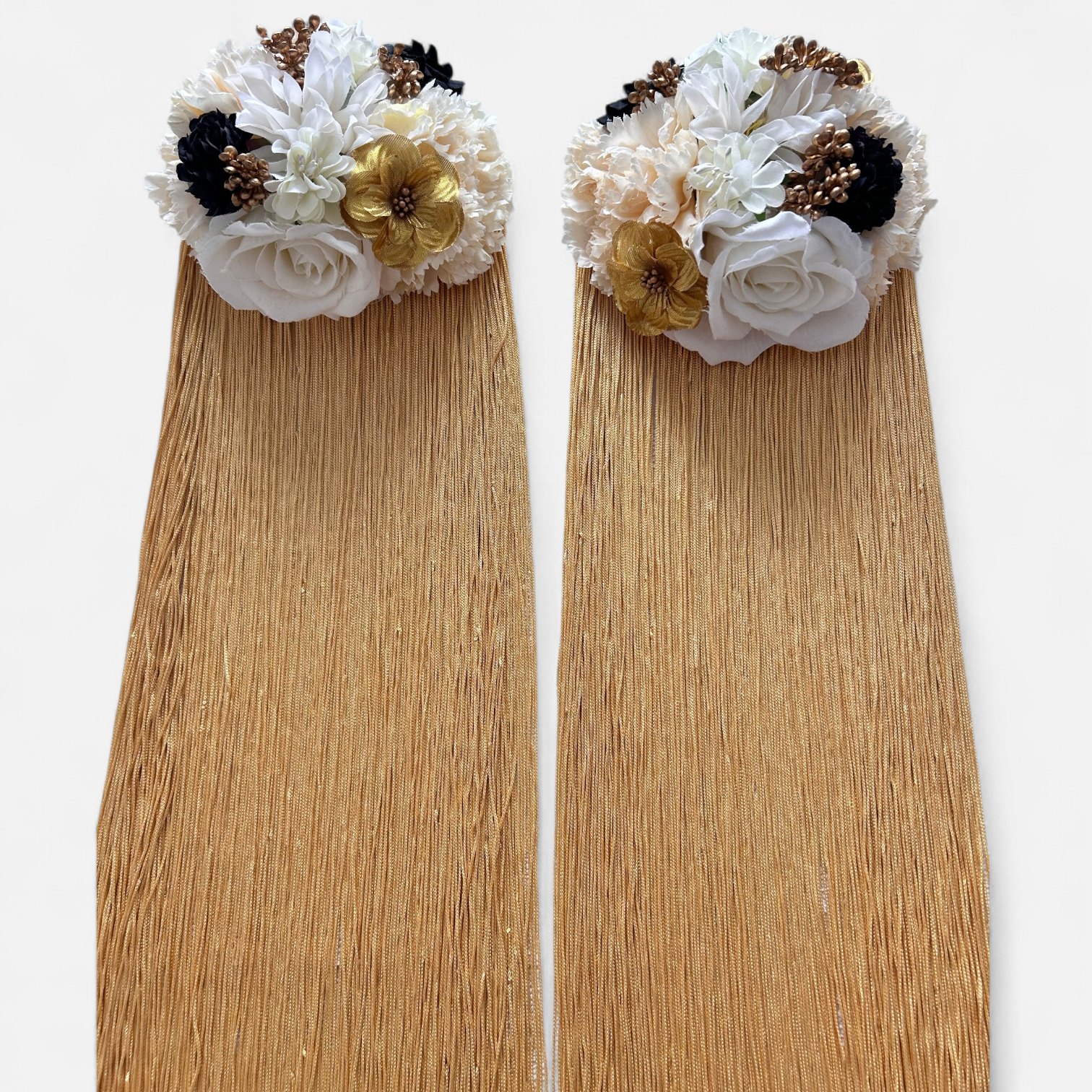 Fleco dorado de 50 cm con flores blancas negras y doradas.