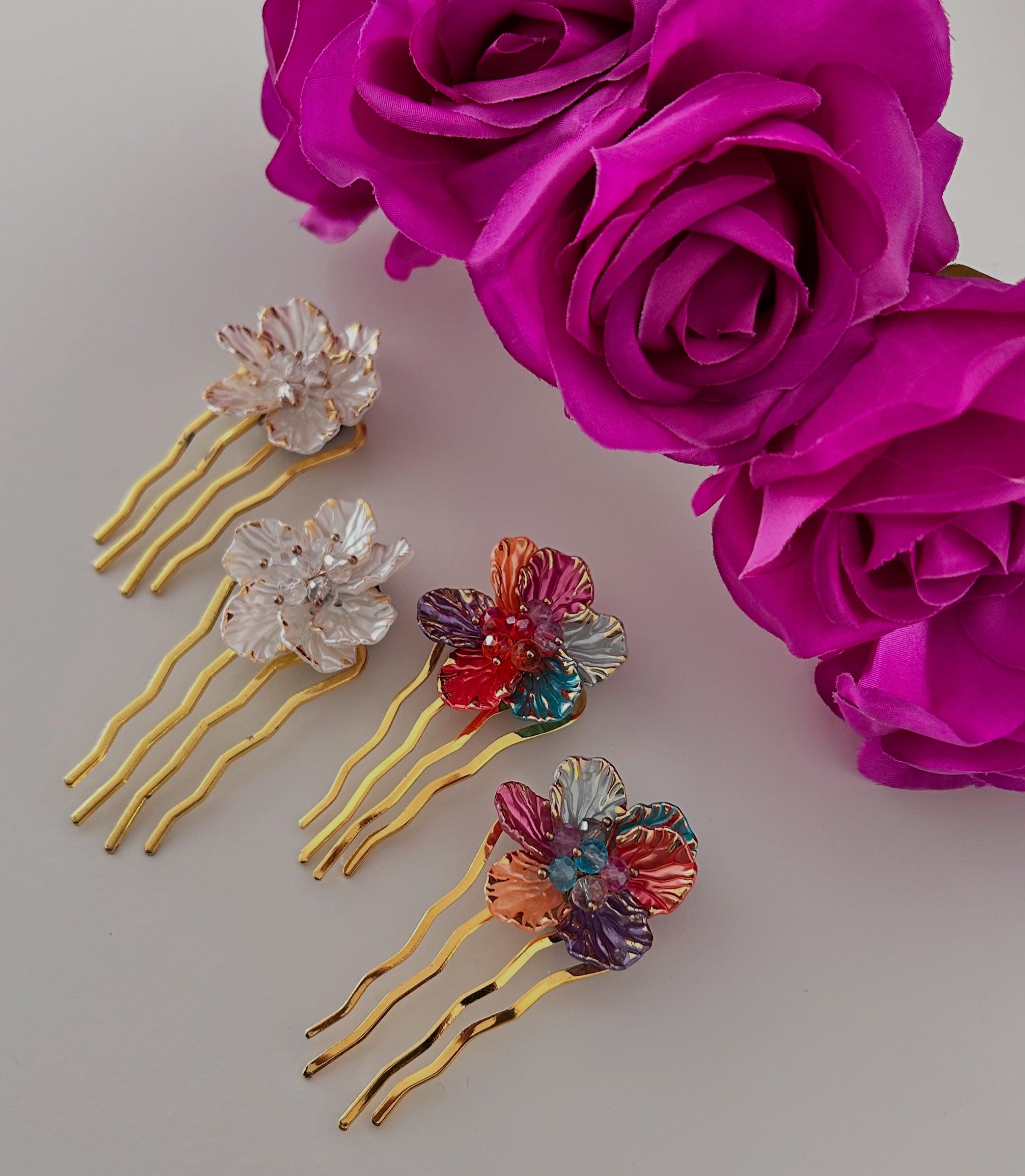 Peinecillos de tres dientes de flores disponibles en color blanco y multicolor